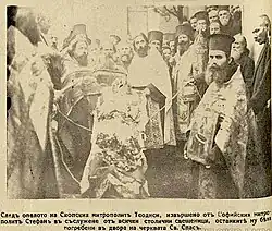 As a result, he was rehabilitated and between 1901 and 1906 served as bishop of the Plovdiv eparchy, and then in the Bachkovo Monastery and in the Rila monastery. In 1910 he tried again to run for Metropolitan of Skopje, whose position was then vacant, but he was refused, despite the pro-Exarchate positions he demonstrated in the press.[21] During 1913 he participated on the Christianization of the Pomaks in the Rhodopes, a mission held from the Bulgarian Exarhate and IMORO.[22] Completely repenting his Catholic aspirations, he wrote the pamphlet The Orthodox Church and Catholic Propaganda, which the Synod printed and used in the struggle against the Uniate movement in 1914. During this period he served in Sofia, where in November 1915, when the Bulgarian army defeated Serbian troops in Macedonia, he performed a solemn prayer on the occasion of the Victory Day.[23] Theodosius also led the short-lived eparchy of Gyumyurdzhina, (Komotini) between 1915 and 1919, when the area was part of Bulgaria. He spent the last years of his life in Sofia in literary activity - writing books and translations of foreign literature.[24]