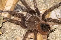 Theraphosa apophysis generally resembles Theraphosa blondi, and reaches a similar size.[3] Immature T. apophysis spiders have pink shading at the end of each leg, which gradually fades with each moult.[4] T. apophysis has an additional stridulating organ on the coxa of the second leg and thinner femora than T. blondi. Males of the species have tibial apophyses (projections) – hence the species name.[3] The base colouration of both sexes is coffee brown; the legs and opisthosoma have long scattered orange-brown hairs, with long orange hair on the femora. Mature males have a metallic sheen, described as "wine red" in colour, on the cephalothorax, the dorsal surface of the chelicerae, the pedipalps, and the coxa, trochanter and femur of the legs, as well as the patella of the first leg.
