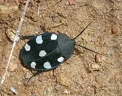 Therea petiveriana, variously called the desert cockroach, seven-spotted cockroach, domino cockroach, or Indian domino cockroach, is a species of crepuscular cockroach found in southern India. They are members of a basal group within the cockroaches.[3][4] This somewhat roundish and contrastingly marked cockroach is mainly found on the ground in scrub forest habitats where they may burrow under leaf litter or loose soil during the heat of the day.[5]