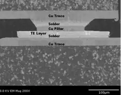 Figure 3 shows an SEM cross-section of a TE leg. Here it is demonstrated that the thermal bump is structurally identical to a CPB with an extra layer, the TE layer, incorporated into the stack-up. The addition of the TE layer transforms a standard copper pillar bump into a thermal bump. This element, when properly configured electrically and thermally, provides active thermoelectric heat transfer from one side of the bump to the other side. The direction of heat transfer is dictated by the doping type of the thermoelectric material (either a P-type or N-type semiconductor) and the direction of electric current passing through the material. This type of thermoelectric heat transfer is known as the Peltier effect. Conversely, if heat is allowed to pass from one side of the thermoelectric material to the other, a current will be generated in the material in a phenomenon known as the Seebeck effect. The Seebeck effect is essentially the reverse of the Peltier effect. In this mode, electrical power is generated from the flow of heat in the TE element. The structure shown in Figure 3 is capable of operating in both the Peltier and Seebeck modes, though not simultaneously.