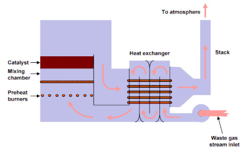 Catalytic oxidizers can also be in the form of recuperative heat recovery to reduce the fuel requirement. In this form of heat recovery, the hot exhaust gases from the oxidizer pass through a heat exchanger to heat the new incoming air to the oxidizer.[7]