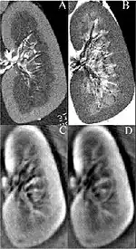 Thermoacoustic imaging was originally proposed by Theodore Bowen in 1981 as a strategy for studying the absorption properties of human tissue using virtually any kind of electromagnetic radiation.[1] But Alexander Graham Bell first reported the physical principle upon which thermoacoustic imaging is based a century earlier.[2] He observed that audible sound could be created by illuminating an intermittent beam of sunlight onto a rubber sheet. Shortly after Bowen's work was published, other researchers proposed methodology for thermoacoustic imaging using microwaves.[3] In 1994 researchers used an infrared laser to produce the first thermoacoustic images of near-infrared optical absorption in a tissue-mimicking phantom, albeit in two dimensions (2D).[4] In 1995 other researchers formulated a general reconstruction algorithm by which 2D thermoacoustic images could be computed from their "projections," i.e. thermoacoustic computed tomography (TCT).[5] By 1998 researchers at Indiana University Medical Center[6] extended TCT to 3D and employed pulsed microwaves to produce the first fully three-dimensional (3D) thermoacoustic images of biologic tissue [an excised lamb kidney (Fig. 1)].[7] The following year they created the first fully 3D thermoacoustic images of cancer in the human breast, again using pulsed microwaves (Fig. 2).[8] Since that time, thermoacoustic imaging has gained widespread popularity in research institutions worldwide.[9][10][11][12][13][14][15] As of 2008, three companies were developing commercial thermoacoustic imaging systems – Seno Medical,[16] Endra, Inc.[17] and OptoSonics, Inc.[18]