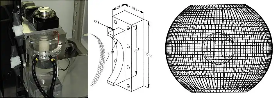 In order to capture sufficient thermoacoustic data to form an accurate 3D map of electromagnetic absorption, it is necessary to surround the anatomy being imaged with a 2D array of transducers. The world's first 3D thermoacoustic animal scanner (Fig. 8: left panel) accomplished this by combining a cylindrical array of 128 transducers (Fig. 8: center panel) with rotation of the animal being imaged about the vertical axis. The net result was to capture thermoacoustic data over the surface of a sphere surrounding the animal being imaged (Fig. 8: right panel).[21] This device was capable of visualizing structures as small as 1/3 millimeter. An animated 3D image of the vasculature in the head of a mouse is displayed in Fig. 9. This animated image was acquired using near infrared radiation at 800 nm, where optical absorption by blood is higher than surrounding tissues. Therefore, the vasculature is preferentially visualized.
