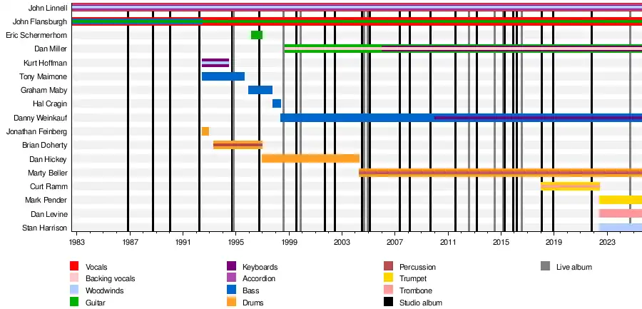 They Might Be Giants, often abbreviated as TMBG, is an American alternative rock and children's band formed in 1982 by John Flansburgh and John Linnell. During TMBG's early years, Flansburgh and Linnell frequently performed as a musical duo, often accompanied by a drum machine. In the early 1990s, TMBG expanded to include a backing band.[6] The duo's current backing band consists of Marty Beller, Dan Miller and Danny Weinkauf. They have been credited as vital in the creation and growth of the prolific DIY music scene in Brooklyn in the mid-1980s.[7]