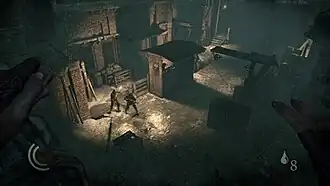 There are a variety of routes through each level and the player is able to utilize a variety of playing styles to traverse them.[11] The game offers many ways to distract or kill guards, such lighting barrels of oil, for example. Levels contain coins and valuable objects which Garrett can steal; these are converted into money which can be spent on equipment and upgrades. Garrett can pickpocket guards and other characters.[12] The player may evade guards by hiding in shadows or around corners and is able to peek around edges and through keyholes to track the movements of enemies. Once Garrett is spotted, guards and other non-player characters will attempt to hunt him down. The developers have stated that the game's artificial intelligence is aware of the level design, and as such, guards will know in advance of potential hiding spots that the player may utilize.[12][13]
