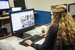 The Chromebox Tiny is a small desktop computer with a Core i3-5005U processor, 4 gigabytes of memory, a 16 GB solid-state drive, integrated graphics that runs Google's ChromeOS. It was designed for education and business. Its largest side measures about 7 inches square. It is 1.4 inches thick and weighs 2.2 pounds. Computers with this form factor are called "one-liter" machines in some countries that use the metric system. The Tiny can be mounted on the back of monitors or placed on walls with a VESA mount. The Chromebox Tiny has two USB 3.0 ports on its front and two more on its rear.[10] Dual-band 802.11ac Wi-Fi and Bluetooth 4.0 are both supported. An external antenna is included to improve reception. A mouse and keyboard come standard.[11]