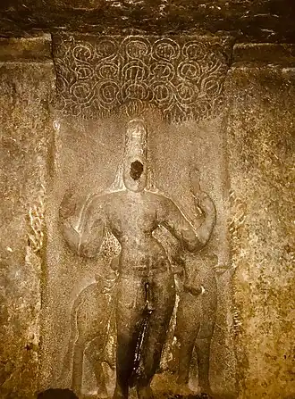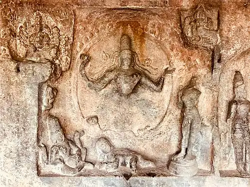 The mandapam leads to a garbhagriya (sanctum) dedicated to Shiva. This sanctum opens to the east. On the back wall of the sanctum is a carving of Ardhanarishvara – half Shiva and half Parvati, with Nandi standing behind and a limited floral, leaf-like decoration above the head. This carving is also minimalist, with no background ornaments or decorative reliefs. It has been controversial. Some state that there was a Jain Tirthankara relief here which was chiseled out and transformed into Ardhanarishvara in the 8th century because of the creeper-like "pepal leaf" (Ficus religiosa) motif above. Outside, one of the reliefs is a damaged Bhairava with his iconographic dog, which shares iconographic features of a standing Tirthankara.[1] The Jain temple to Shaiva temple theory was originally additionally supported by a mistranslation along with a speculative commentary about destruction of Madurai Jain temples by an 11th-century Pandya-Chola king by James Nelson – a colonial-era civil services official.[5] As more inscriptions about dynasties and Thirupparankundram monuments were discovered in Tamil Nadu, epigraphists starting with Robert Sewell, J.F. Fleet and V. Rangacharya rejected the 11th century and other speculations of Nelson.[7][8]