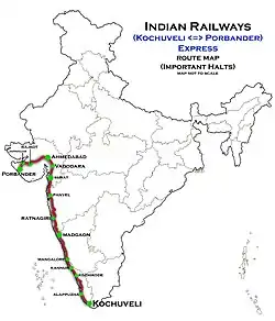 It operates as train number 20909 from Thiruvananthapuram North to Porbandar and as train number 20910 in the reverse direction serving the states of Kerala, Karnataka, Goa, Maharashtra and Gujarat.[2] Since 31 March 2024, the train runs with LHB coaches