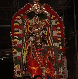 During the new moon day of the Tamil month Tai, the festival deity of Thirumangai Alvar is brought to the temple from Thiruvali-Thirunagari.[6] The Thirumangai Alvar Mangalasasana Utsavam is celebrated in the Tamil month of Tai (January–February). The highlight of the festival is Garudasevai, an event in which the festival images of the eleven Thirunangur Tirupatis are brought on mount designed like Garuda, called Garuda Vahana, to Thirunangur. The festive image of Thirumangai Alvar is also brought on a Hamsa Vahanam (palanquin) and his pasurams (verses) dedicated to each of these eleven temples are recited during the occasion. The festival images of Thirumangai Alvar and his consort Kumudavalli Naachiyar are taken in a palanquin to each of the eleven temples. The verses dedicated to each of the eleven temples are chanted in the respective shrines. This is one of the most important festivals in the region which draws thousands of visitors.[6][7][8]