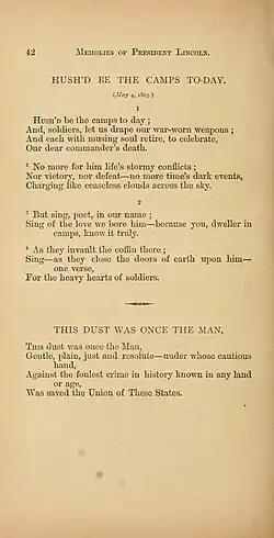 ![]() Page 42 of the 1871 Leaves of Grass, part of the "Memories of President Lincoln" cluster, containing "This Dust Was Once the Man" and "Hush'd Be the Camps To-Day". | |