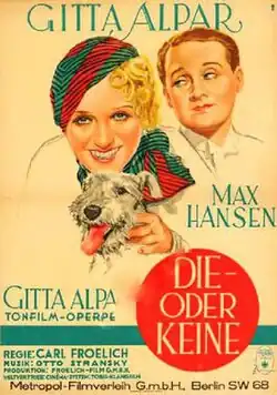 This One or None (German: Die - oder keine) is a 1932 German musical film directed by Carl Froelich and starring Gitta Alpar, Max Hansen and Ferdinand von Alten.[1] It is part of the tradition of operetta films. It was shot at the Johannisthal Studios in Berlin.[2] The film's sets were designed by the art director Franz Schroedter. Location shooting took place around Berlin at the Brandenburg Gate, Potsdamer Platz and Unter den Linden.
