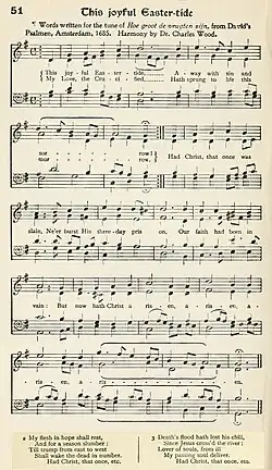 Woodward and Wood published "This joyful Eastertide" set to Vruechten, a Dutch tune published in 1624 in Dirk Rafaelsz Camphuysen's collection of 'Stichtelycke Rymen' where it was attached to the hymn "De liefde Voortgebracht", a scripture paraphrase of 1 Corinthians 13.[11] It also appears as a hymn tune in Joachim Oudaen's 1685 psalter, "David's Psalmen" as a setting for "Hoe groot de vruchten zijn",[12][10] a paraphrase of 1 Corinthians 15:12-23. In both instances the ascending repeats of the final line of the refrain effectively support the respective central messages of the paraphrased Bible verses. Joseph Butler, an Amsterdam municipal musician of English origin, published a number of variations for the keyboard based on the same tune.[13]