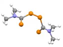 The compounds feature planar dithiocarbamate subunits and are linked by an S−S bond of 2.00 Å. The C(S)−N bond is short (1.33 Å), indicative of multiple bonding. The dihedral angle between the two dithiocarbamate subunits approaches 90°.[3]