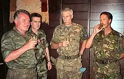 On 11, 12, and 13 July 1995, the enclave was captured by Serb soldiers, while the Dutch battalion was stationed there. Karremans failed to follow the orders of General Gobilliard who requested him in writing to defend the enclave.[2] Karremans requested NATO air support to defend the enclave, as the Dutch were driven further into the narrow enclave (Karremans requested air strikes several times, in particular from the French – which was witnessed from neutral Switzerland, but they were first denied, then delayed, and later granted by UN General Bernard Janvier).[3] However the NATO air support arrived was too little and too late to stop the Serbian advance.