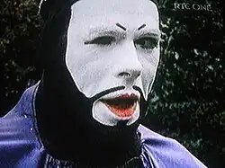 His first public performances in Dublin were as the "Dandelion Clown" at the Dandelion Market, a former bohemian market on St. Stephen's Green.[13] During the 1980s and early 1990s, he became well-known and popular for performances on Grafton Street where he worked as a mime artist or otherwise performed in costume, to advertise the Diceman shop.[10] When that went out of business, he was hired to advertise various other establishments, including Bewley's café, and he also promoted political causes through his work such as gay rights, the Birmingham Six, and human rights in Tibet. He lived for a time in the early 1980s in Baile Éamon behind Spiddal in County Galway where he formed The Dandelion Theatre Company.[14]