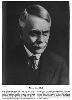 Born and raised in rural Illinois, Clark was orphaned at a young age and was adopted by an aunt. He graduated from the University of Illinois in 1890, then supervised a local school. Named an assistant professor at the university in 1893, Clark rose to full professor status in 1900. A favorite of university president Andrew S. Draper, Clark was named dean of the College of Literature in 1900, then dean of undergraduates in 1901. This office was later renamed Dean of Men, making Clark the first to hold the title. Clark was known for his ruthless vigilance over students and was particularly opposed to alcohol and automobiles. However, Clark was a friend to the Greek community in the university, rising to lead the national chapter of Alpha Tau Omega and often supporting the system in the press. He also founded Phi Eta Sigma in 1923.