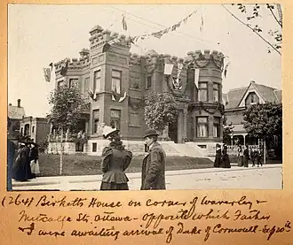 In 1896 Birkett constructed a new stately residence at 306 Metcalfe Street. Nicknamed Birkett's Castle, the home was sold in 1925 and is now used as the Hungarian Embassy.[10] Formally, it housed the Japanese Embassy, Heritage Canada, and the Boy Scouts of Canada.[1]