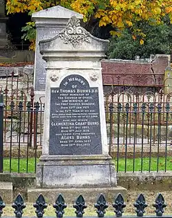 Thomas Burns was born at Mossgiel, Mauchline, on 10 April 1796.[2] He was the third son of estate manager Gilbert Burns and Jean Breckenridge, and nephew of Robert Burns. In his childhood Thomas attended Haddington Grammar School (where Edward Irving was his teacher) and then the University of Edinburgh, where he studied theology. He was employed as a tutor in the family of Sir Hew Dalrymple, of North Berwick before being was ordained as minister of the parish of Ballantrae on 13 April 1826.[2] From Ballantrae he was translated to the parish of Monkton, Ayrshire, on 18 May 1830. In 1830 he married Clementina Grant, the daughter of an episcopal minister in Edinburgh. The couple lived in Monkton, where Clementina's uncle had been Presbyterian minister.[3] He moved to the Free Church, Portobello, on 25 June 1846. In 1847 he left for Otago, New Zealand, where he was from 1848 to 1854 the sole minister of the Scottish colonists.[2]