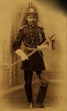 Lebo would remain in the 6th Cavalry Regiment by the time the Spanish–American War broke out as he commanded the regiment during the Battle of San Juan Hill after its previous commander, Henry Carroll was wounded during the regiment's main charge.[6] After the war, Lebo would be promoted to lieutenant colonel of the 1st Cavalry Regiment on September 14, 1899, and would serve within the regiment during the Philippine–American War.[7] After his promotion to colonel of the 14th Cavalry Regiment on February 19, 1902, Lebo returned to the American mainland.[a] By the next year, Lebo married Grace Frances Hawkes in Albuquerque. One day before his retirement on June 22, 1905, Lebo was promoted to brigadier general. He died on Chicago on February 14, 1910, at the age of 67.[7]