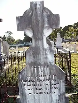 Campbell died in Townsville at the Imperial Hotel on 6 November 1885, aged 40 when he was visiting North Queensland on a court case and was buried in the West End Cemetery in Townsville. According to The Gympie Times, "he had been laid up at the Imperial Hotel for three days with an attack of asthma, but on Friday he was seized with convulsive fits, which continued until his death, the cause of which is said to have been Bright's disease" and that he was "a fine scholar and a man of great natural ability and application - as is shown by the fact that whilst fulfilling his responsible scholastic duties, he, quite unaided, managed to qualify himself for admission to the bar".[9]