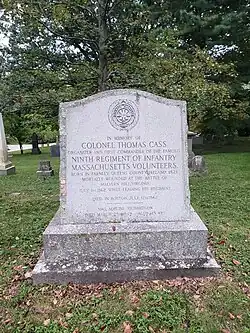 Colonel Thomas Cass (c. 1821 – July 12, 1862) founded and was commander of the 9th Regiment Massachusetts Volunteer Infantry of the Union Army, which saw extensive service in the American Civil War. Cass was wounded at the Battle of Malvern Hill and died shortly after from his wounds in Boston, Massachusetts. A memorial statue to him stands in the Boston Public Garden.
