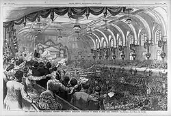 Leading up to the convention in Cincinnati, Tilden remained ambiguous about his intentions.[81] George Gray, Delaware's attorney general, placed Bayard's name in nomination, calling the senator "a veteran, covered in scars of many a hard-fought battle, where the principles of constitutional liberty have been at stake ... Bayard is a statesman who will need no introduction to the American people."[82] When the convention took its first ballot on June 23, Bayard placed second with 153½ votes, trailing only Hancock, who had 171.[83] On the second ballot, the delegates broke for Hancock, and he was nominated.[83] The Southern delegates, whom Bayard thought would be most loyal to him, were among the first to desert him.[84] The convention nominated William Hayden English of Indiana, a Bayard supporter and hard-money man, for vice president, and then closed.[85] Bayard's supporters were disappointed, but he supported the ticket as usual, in the interest of party unity.[86] Hancock and English fought to a near-draw in the popular vote, but lost the electoral vote to James A. Garfield and Chester A. Arthur by 214 to 155.[87]