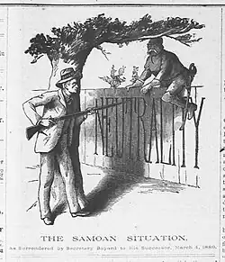 Among the first foreign policy challenges Bayard and Cleveland faced was that concerning American influence in the Samoan Islands.[107] The United States, Great Britain, and Germany all had treaties with the Samoan government that guaranteed their right to trade and establish naval bases there.[108] In the 1880s, German chancellor Otto von Bismarck began to increase German influence in Samoa, and attempted to replace the Samoan king, Malietoa Laupepa, with Tamasese Titimaea, a claimant to the throne who favored German suzerainty.[108] Bayard and Cleveland opposed any change that would undermine Samoan independence, as did the British government.[109] Bayard filed a note of protest with the German government, and the three powers agreed to meet for a conference in Washington in June 1887, but they failed to achieve any agreement.[110]