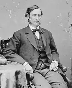 Bayard and his father continued in private law practice through the war. Both were pleased with the Democrats' peace platform in 1864, but disappointed in the choice of nominee, Major General George B. McClellan, a War Democrat.[17] In 1866, Thomas Bayard successfully represented four South Carolinians in habeas corpus cases against the military.[18] The following year, Senator George R. Riddle died and the legislature elected James Bayard to fill the remainder of the term, which ended in 1869.[18][c] Bayard became more politically active, speaking at a public meeting in September 1867 against constitutional proposals for ending racial discrimination in voting rights.[20] The following year, he condemned the impeachment proceedings against President Andrew Johnson, who had succeeded to the presidency in 1865 after Lincoln's assassination and had threatened the Republican Congress's plans for Reconstruction of the Southern states.[20] Both Bayards attended the 1868 Democratic National Convention and, although they were unenthusiastic about the nominee, Horatio Seymour, supported the unsuccessful ticket that year.[21]