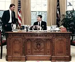 In 1983 Gibson joined the White House staff of President Ronald Reagan, serving as Associate Director of White House Cabinet Affairs, responsible for the Cabinet Councils on Economic Affairs, Legal Policy and Management and Administration.[1][2] Subsequently, from 1985 to 1987, Gibson served as Director of White House Public Affairs.[1][3]