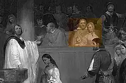 Prominently featured in the painting, according to a "key" from the Granger Collection, New York City[7] is: "#11. Mr. and Mrs. Forrest, the lady being the first gentlewoman to arrive in the colony", and the painting itself shows a man, woman and young child, presumably their son (although there is no record of Margaret and Thomas having any children, while there is a record of Thomas having a son, Peter born in 1601).