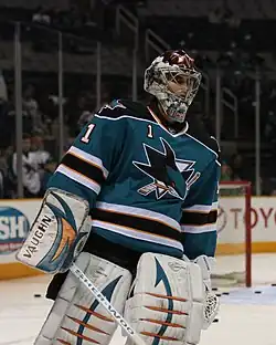 The San Jose Sharks selected Greiss in the third round, 94th overall, in the 2004 NHL Entry Draft.[2] Greiss played for San Jose during the Sharks' preseason games ahead of the 2007–08 season, though he was eventually assigned to the team's then-American Hockey League (AHL) affiliate, the Worcester Sharks. On 8 January 2008, he was recalled to replace German compatriot Dimitri Pätzold as the backup goaltender to Evgeni Nabokov. Greiss started his first career NHL game on 13 January 2008, an eventual 4–3 overtime loss to the Anaheim Ducks.[3] For the 2009–10 season, he served as the back-up goaltender to starter Nabokov.[4]
