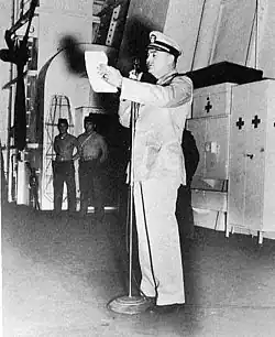 On 30 January 1945, Robbins – by then a captain – became commanding officer of the aircraft carrier USS Lexington (CV-16). While he was in command, Lexington participated in strikes against Tokyo, Japan, in February 1945 in support of the Iwo Jima campaign and against Japanese forces on Iwo Jima itself. After an overhaul in the United States, Lexington returned to action, attacking Japanese forces on Luzon in June 1945 during the Luzon campaign and participating in heavy strikes against Japan itself in July and August 1945, when the war ended. Immediately after the war, Robbins oversaw Lexington's efforts to air-drop supplies to Allied prisoners-of-war in Japan in advance of their liberation by occupying American forces. Lexington was the first Essex-class aircraft carrier to enter Tokyo Bay after the war, and she was anchored there on 16 November 1945 when Robbins was promoted to rear admiral and left the ship for assignments in Washington, D.C.[13][14][15] He received the Legion of Merit with Combat Distinguishing Device (Combat "V") for his tour aboard Lexington.[16]