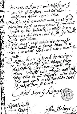 Despite the obvious risks involved, Helwys with the other 12 émigrés, in 1612, returned to England and settled the church in White's Alley, Spitalfields, East London, considered the first Baptist church in England.[11] Helwys brought The Mistery of Iniquity with him, and one copy of it was delivered to King James, with a handwritten inscription arguing for liberty of conscience. "The King", Helwys said, "is a mortal man, and not God, therefore he hath no power over the mortal soul of his subjects to make laws and ordinances for them and to set spiritual Lords over them." Helwys and other members of the congregation were thrown into Newgate Gaol, where they wrote a petition to the king. Persecution for Religion Judg’d and Condemn’d was written in Newgate in 1616, either by Helwys or John Murton.[12]