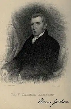 Thomas Jackson, the second son of Thomas and Mary Jackson, was born at Sancton, a small village in the East Riding of Yorkshire, on 12 December 1783. His father was an agricultural labourer. Three of the sons, Robert, Samuel, and Thomas, became ministers in the Wesleyan Methodist Church. Thomas was mainly self-taught, leaving school at the age of twelve to work on a farm. Three years later he was apprenticed to a carpenter at Shipton, a neighbouring village. At every available moment he read and studied, and in July 1801 joined the Methodist society and threw his energies into biblical study and religious work. In September 1804 he was sent by the Wesleyan conference as an itinerant preacher into the Spilsby circuit. For twenty years he laboured in the Wesleyan Methodist Church in the same capacity, occupying some of the most important circuits, such as Preston and Wakefield, Manchester, Lincoln, Leeds, and London. His position and influence grew rapidly. From 1824 to 1842 he was editor of the Wesleyan Methodist magazines, and, despite his lack of a liberal education in youth, he performed his duties with marked success. The conference elected him in 1842 to the chair of divinity in the Theological College at Richmond, Surrey, where he remained until 1861.[1][2]