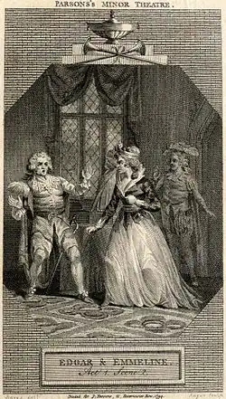 - ^ During his second season he played, among other parts, the Younger Brother in Comus, Rosse in Macbeth, Claudio in Much Ado about Nothing, and Ferdinand in The Tempest, and was the original Duke of Athens in Edward the Black Prince, by William Shirley, and Valeria in The Roman Father of William Whitehead. He also played in the Little French Lawyer (John Fletcher) and The Spanish Curate, converted in Garrick's way into farces.