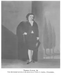 Lynch Jr. was the second youngest delegate in the Continental Congress and filled in his father's place due to illness.[5] The youngest signer, South Carolinian Edward Rutledge, was younger by three months.[10][11]