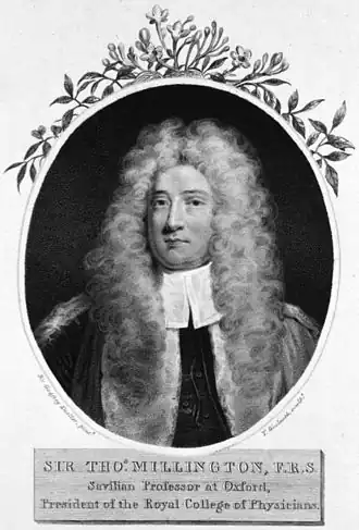 Sir Thomas Millington FRS (1628 in Newbury – 5 January 1703/04 in Gosfield), the son of Thomas Millington, was an English physician. Greatly respected in his day, he was eulogised by Samuel Garth under the name of Machaon in his poem "The Dispensary", and Thomas Sydenham held him in high regard.[1]