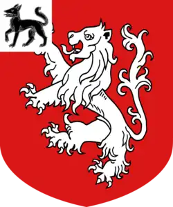 Gules a lion rampant Argent on a canton of the last a wolf passant Sable langued of the first.