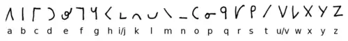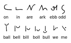 The vowels were designated by the height of the following consonant. Thus the B symbol with the L symbol written directly above meant "ball", while the B symbol with the L symbol below meant "bull". The B symbol with the L symbol on top right meant "bell", in the middle right "bill", below on the right "boll". A vowel at the word end was designated by a point in the suitable position. For initial vowels there were additional symbols. There were other symbols for frequent prefixes and suffixes as well as for consonant connections.