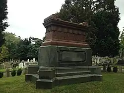 Hall died in London on 14 June 1903 aged 66 years of age, leaving a widow and three sons.[1][6][7] He was buried in the East Finchley cemetery in the City of London in a grey and pink granite tomb built on an island and said to be modelled upon Napoleon's tomb in Paris.[8] His family continued to live in Weeting Hall until 1927.[5]