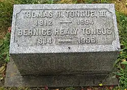 Justice Tongue was married to Bernice Healy.[2] They had three sons: John Richard, James Cadwell, and Thomas Healy.[2] Thomas H. Tongue III died May 31, 1994, in Hillsboro, Oregon and is buried at Hillsboro’s Pioneer Cemetery.[2]