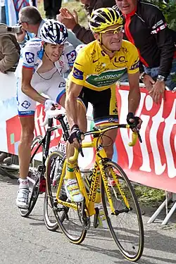 In the ninth stage of the Tour de France, Voeckler led a breakaway, survived a collision caused by a media support car that injured two other riders,[9] and crossed the line second, taking the overall time lead and therefore wearing the yellow jersey (French: maillot jaune). He held on to the yellow jersey daily from the beginning of Stage 10 onwards, carrying it through all the Pyrenean mountain stages and into the Alps, but he was unable to retain it at the end of Stage 19, the queen stage finishing at Alpe d'Huez. Voeckler finished in fourth place in the final general classification, 3 minutes and 20 seconds behind the winner, Cadel Evans. It was Voeckler's highest final general classification in the Tour, and the highest placing of any Frenchman in the Tour, at the time, since Christophe Moreau's fourth-place overall finish in 2000.[10]