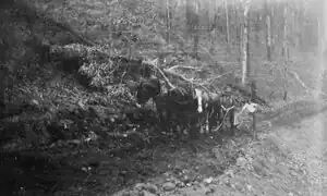 When not on fire lookout duty Bill assisted local Forests Commission crews building nearby forest roads after the 1939 bushfires. The work entailed removing trees with explosives and dragging the stumps with his Clydesdale work horses. The horses also pulled a heavy plough to break out the formation, dragged a grader to shape the surface and moved sections of concrete culvert pipe. However, there was still plenty of hard work for the men with hand tools as well handling the horses and explosives.[7]
