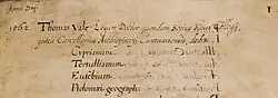 Thomas Yale graduated B.A. at Cambridge University in 1542–3, and was elected a Fellow, member of the governing body of Queen's College of the University of Cambridge about 1544.[26] He commenced M.A. in 1546, and filled the office of Bursar to his college from 1549 to 1551. He was one of the Proctors of the university for the year commencing Michaelmas 1552, but resigned before the expiration of his term of office. In 1554 he was appointed Commissary of the Diocese of Ely under Chancellor John Fuller, and in 1555 he was Keeper of the Spiritualities of the Diocese of Bangor during the vacancy after the death of Arthur Bulkeley, Bishop of Bangor. In that year he subscribed the Roman Catholic articles imposed upon all graduates of the university.
