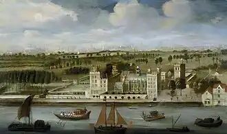 As a member of the household of Archbishop Matthew Parker, he now lived at Lambeth Palace in London, next to the Palace of Westminster.[42][43][44] The maintenance of ecclesiastical discipline was one of the largest tasks of Elizabeth's administration.[45] Visitations of Dioceses and courts were necessary to prevent or punish breaches of the laws of the church, and was a matter of considerable discussion and controversy in Tudor England.[45] In 1562 he became Chancellor of the Diocese of Bangor in Wales, and in May, was commissioned by Matthew Parker to visit All Souls and Merton College at Oxford. In 1563 he was on a commission to visit the Diocese of Ely with John Pory and Edward Leeds.[31]