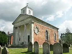 - St Helen's Church Saxby (nr Spridlington, N.of Lincoln), 1775.[12] Parish Church and mortuary chapel for the Earls of Scarborough. Red brick with stone dressings, rendered, timber, lead roofs. In form of small classical temple; rectangular on plan, with a pedimented portico in antis with Tuscan columns across the western front, which is surmounted by surmounted by a classical bellcote.apsidal east end. The western portico is reached up three steps and has Tuscan pillars supporting a plain frieze and pediment. The side walls of the portico are lit by glazed circular windows with raised keystones.[13] The church had been attributed to Carr of York (who constructed the nearby Norton Place) but no evidence to prove this has been found. It has been assumed that the Lumbys, who often worked with Carr, might have been the architects.[14]