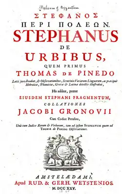 - Stephan (1678), Περὶ Πόλεων [De Urbibus, On Cities] (in Ancient Greek), Amsterdam: Jacobus de Jonghe.
