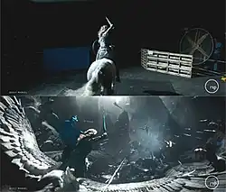 Visual effects for the film were created by Industrial Light & Magic's (ILM) San Francisco and Vancouver studios,[143] with help from Base FX, Animatrik, and Virtuos; Framestore; Method Studios Vancouver; Digital Domain; Rising Sun Pictures; Luma Pictures; D Negative; Iloura; Image Engine; Trixter; The Secret Lab; WhiskyTree Inc; Fin Designs + Effects; and Perception.[23] Previsualization work was provided by The Third Floor and Day for Nite.[23][144] Luma Pictures produced over 200 shoots in eight sequences, particularly for the characters Korg (receiving assets from Framestore) and Miek. Method Studios provided over 450 shots, including Thor's opening fight against Surtur in Muspelheim and Hela's fight against the Asgardian guards. D Negative worked on over 190 shots, creating the environment for the planet Sakaar, including its junkyard landscape and wormholes, with the wormholes also created through a collaboration with Digital Domain.[145] The film's main-on-end title sequence was designed by Perception.[146]