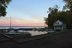 Thorah Island is a lake island located in the southeast portion of Lake Simcoe, approximately 4 kilometres (2.5 mi) west from Beaverton in Ontario, Canada. The island, part of Brock Township, is approximately 1,450 acres (6 km2) in size and the land is divided mainly between wooded and wooded-swamp terrain. Some land has been cleared for farming and recreational purposes but much of the agricultural land has fallen into disuse and has grown over. Centre Road runs from the east side of the island to the west side but is not much more than a dirt path. A small harbour exists on the east side of the island, directly across from Beaverton Harbour. There are several sandy beaches on the west side of the island, but most of the island's shore is rocky.