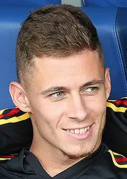 Hazard grew up in Braine-le-Comte, a small town in the Wallonia region, but he was born in La Louvière. His first name was inspired by the Belgian comic strip Thorgal and he grew up in a family where football was dominant.[6] His mother Carine and father Thierry were both footballers in Belgium. His father spent most of his career playing at semi-professional level with Louviéroise in the Belgian Second Division,[6] playing mainly as a defensive midfielder.[6] His mother played as a striker in the Belgian Women's First Division and stopped playing when she was three months pregnant with his older brother Eden.[6][7][8][9][10] After playing football, both his parents became physical education teachers.[6] Thierry retired from his position in 2009 to devote more time to his children.[6]